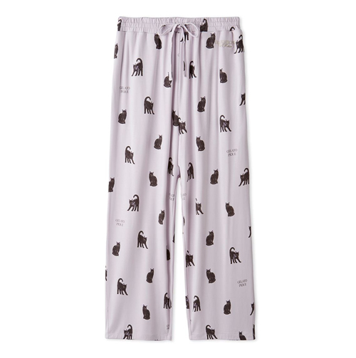 お座りポーズから、猫好きの方にはたまらない威嚇ポーズまで、表情豊かな黒猫を総柄プリントした柔らかなロングパンツ。猫の耳にパープルをあしらった、ハロウィンらしいカラーリングが特徴。