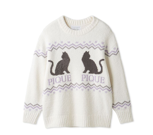温かみのあるノルディック柄の中に、ファーの黒猫とハート、PIQUEロゴを大胆にデザインしたプルオーバー。ふっくり柔らかなニット素材と、ゆったりとしたシルエットが女の子らしい可愛さを演出。