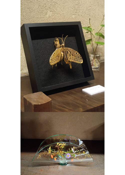 また、窓ガラスに使用する工業用の板ガラスを用いてグラスやお皿などのクラフト作品を制作している。