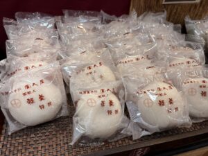 こちらは看板商品の「献上 かるかん饅頭」(1個216円)の白です。天然の山芋を使用したふんわり軽い食感が特徴💓中にはこしあんが入っています。