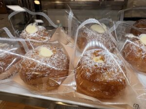 「もちシュー」(230円)は、お餅を使った新食感のシュークリーム。もっちりした生地と滑らかなカスタードクリームがマッチします🥰
