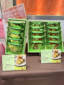 新商品の「博多の森 生キャラメルサンド(ピスタチオ)」(5個入1,350円/10個入2,592円)も人気。やさしい甘さと香ばしいピスタチオの香りが口いっぱいに広がります✨