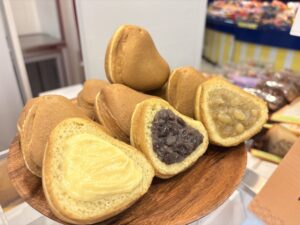 かわいいひよ子の形をした「冷凍 博多ひなのやき」(赤あん、白あん、かすたーど 各1個220円)は、こだわりの素材でつくり上げたふわふわもっちり生地が魅力。特に人気なのは、かすたーどです👏💗