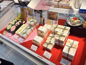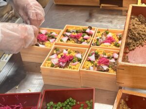 〈とり松〉の看板商品で、京都府・京丹後地方に古くから伝わるお寿司「ばらずし」(1人折 1,296円)をつくっていました!独自の製法で炒り炊きした「鯖のおぼろ」や、椎茸、錦糸玉子などをすし飯の上に重ねています。色鮮やかで食欲をそそりますね😋