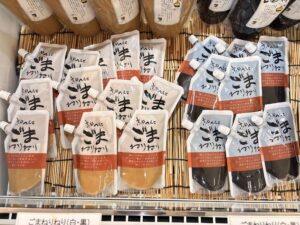 特製石臼2回挽き仕上げの「ごまねりねり(白・黒)」(写真、150g 648円/500g 1,728円)は、料理にさっと使えて便利です✨