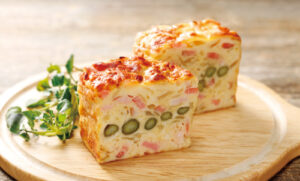 可愛い形にカットされた「パウンドキッシュ」はしっとり食感がたまらない魅力たっぷりの一品😻 紅ズワイガニや北海道たまねぎ、十勝産とうきびなど北海道ならではの風味が揃います🦀🌽