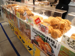 井筒屋創業90周年記念特別商品「ジャンボタラバガニコロッケ」(毎日限定数80)は北海道の恵みがたっぷり詰まった大ぶりスタイル👍♪ そのほか目移りしそうな種類のコロッケが並びます✨