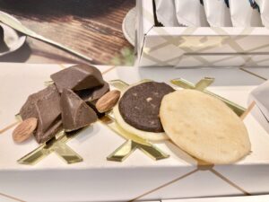 「煎餅サンド(プラリネチョコ)」(5個入1,296円)は、プラリネペーストとローストアーモンドを合わせた、香ばしいチョコクリームをサンドしたひと品。塩気のある煎餅との甘じょっぱい組み合わせがクセになります🌰✨