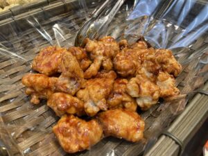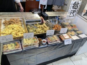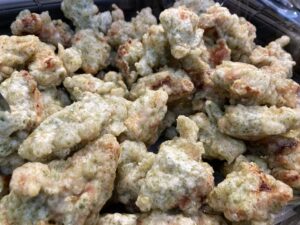 大分県の郷土料理、とり天を実演販売しています✨とり天は、冷めてもやわらかく、とてもジューシー💕変わり種の商品が、目を引きました!「とり天 甘辛」(100g 530円)は甘辛だれで仕上げた、コクのある味わい🌟