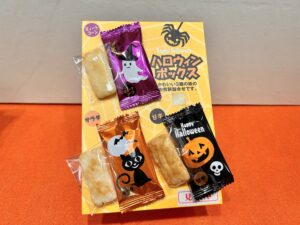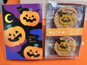 ハロウィンのかわいいパッケージに入った、柔らかく食べやすいお煎餅3種(サラダ、甘辛、スイートコーン)の詰合せです🍘