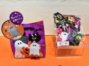 黒猫やカボチャ、おばけたちのミニバッグにチョコレートやクッキーを詰め合わせました。暗いところで光るおばけストラップ付き👻
