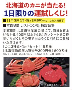 本館8階 北海道物産展会場にて、当日お買上げ合計5,400円以上(税込)のレシートをご持参いただくとその場で当たるくじ引きにご参加いただけます。
