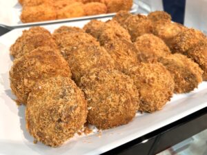 井筒屋創業90周年記念特別商品◎「小倉井筒屋限定 ビーフシチューコロッケ(写真、1個584円)」(毎日限定数100)は、北海道産の牛肉がゴロゴロ入っていて食べ応えあり😊