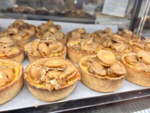 井筒屋創業90周年記念特別商品◎「ベビーホタテのキッシュ(写真、1個580円)」(毎日限定数100)は、北海道産噴火湾産のベビーホタテが贅沢に5個ものり、中には炒り卵が入っていてたまらない😋