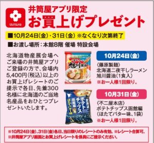 北海道物産展会場へご来場の井筒屋アプリご登録の方で、会場内5,400円(税込)以上のお買上げレシートのご提示で、先着300名様に下記の北海道のご地名産品をおひとつプレゼントいたします🎁