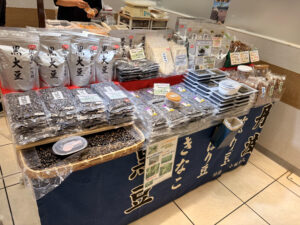 こちらでは丹波黒大豆や、手づくりのべっこう飴などをご用意しています。おすすめは、「丹波黒大豆」(写真左150g、1,080円/300g、2,160円)✨そのまま煎り豆として食べても、お湯を注いで黒豆茶として飲んでもおいしく楽しめます。😋