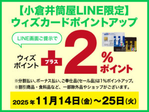 お会計前に、井筒屋アプリ、小倉井筒屋LINEより配信された「ポイントアップ画面」をご提示いただくと、ウィズカードでのお買物が、+2%ポイントアップ!