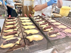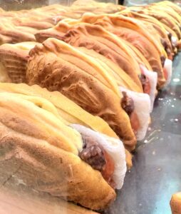 サクサクもちもち生地に、北海道産あずきやクリームがたっぷり入った大人気のたい焼き💕つぶあん・栗入りくりあん・いちご大福・カスタードクリーム・キャラメルマキアート・レアチーズの全6種(各200円)の味があります。定番人気は王道の「つぶあん」と「カスタードクリーム」👑