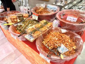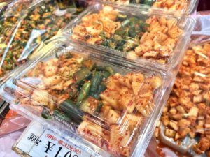 こちらでは素材をカットし、にんにくと唐辛子、秘伝の漬け液を混ぜ合わせてつくる自家製キムチを販売しています✨白菜やきゅうりなどの定番キムチはもちろん、らっきょうキムチ、にんにくキムチ、えごまの葉キムチなど個性豊かなラインナップ🌶️💛
