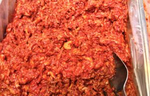 「チャンジャ」(100gあたり896円)もおすすめです。そのままおつまみにしてもおいしいですが、クリームチーズと合わせても絶品なのだそう🤤🧀