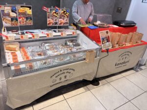 北海道・厚岸や根室の漁港から、新鮮な海の幸を市場を通さず直送🚚旬の素材を、その時期いちばんおいしいかたちで届ける〈ことぶきや〉✨売場には甘えびやホタテ、ほっけなどを使ったフライがずらり😍