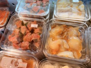 おつまみにぴったりな海鮮加工品も充実。ここでしか買えない「紅鮭磯風」(写真左、100g 1,080円)と「ウニ紋甲」(写真右、100g 1,080円)も要チェック😋💛