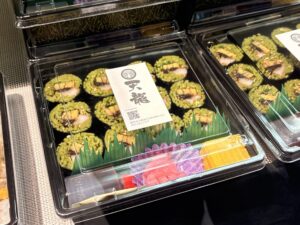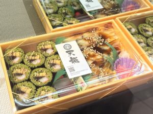 福岡県・苅田町にある、地域に愛される寿司割烹が出店中🍣✨名物は、茶そばで巻き上げた見た目にも楽しい「天龍そば寿司」(1折864円)。