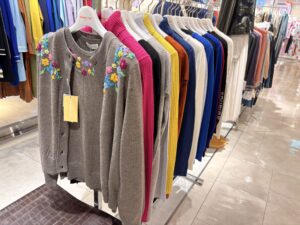 首元に鮮やかな花柄刺繍をあしらったカーディガン(13,200円)とカットソー(12,100円)は、装いをぱっと明るくしてくれる一枚です🌸