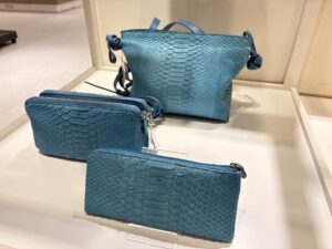 中でも注目は、金運アップの象徴とされる蛇革を使ったバッグ(写真奥33,000円/写真中16,500円)と財布(写真手前14,300円)🐍💗上品なブルーが印象的で、春の装いにも映えるアイテムです🌷