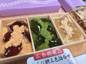 「わらび餅3色詰合せ」(1,300円)は、本わらび粉を使っており、とろけるような食感が魅力🤍波照間産黒糖・宇治抹茶・きなこの3つの味が楽しめるセットです♪