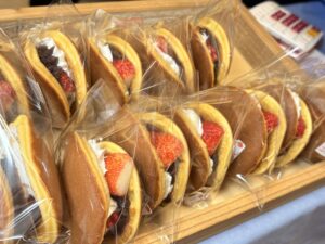 ご奉仕品の「イチゴホイップどら焼き」(1個340円、限定数50、販売期間:2026年3月24日(火)まで)。長崎県国見産のいちごをまるごと1粒使い、つぶあんと一緒にふんわり生地でサンド✨いちごの甘さと、もっちり食感のどら焼きが相性抜群です😋