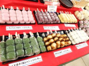 食べ応えのある柔らかな串団子は、あん入り、みたらし、よもぎ(あん入り)、芋、紫芋、いちごミルクの6種類🍡「味比べお得セット」もあります👍