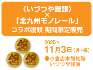 市民の足として親しまれる「北九州モノレール」開業40周年を記念して、企救丘車両基地で開催の「モノレールまつり2025」当日に、記念ロゴ焼印のコラボ饅頭を限定販売いたします⤴ ※お一人様30個まで ※事前予約不可