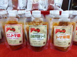 大正2年創業〈ごとう醤油〉とのコラボは、素材の良さを十分に生かした万能トマト調味料💗左より「キタキュウトマ唐(とう)」「洋風ぬかだきソース」「トマ味噌」🆗