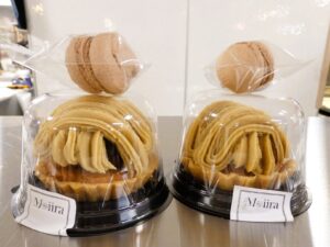 井筒屋開店90周年限定の有機チョコレートケーキで作ったビターな藻塩のガトーショコラを包んだ「和栗モンブラン」と、平飼い卵のふんわりカステラの「和栗ケーキ」♫ 味わう直前に乗せるマカロンはお好みで、あり・なしが選べます🆗