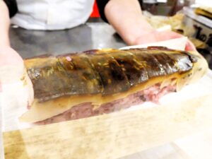 西京漬の肉厚なサバを丁寧に焼いて黒米酢飯で棒鮨に仕上げ、香りのよい竹皮で包んだ京華鮨「鯖」🐟