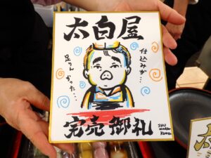 柔らかくて大きな串団子🍡6種類の食べ比べお得セットも👍色紙に描かれた社長の似顔絵がキュートです💓