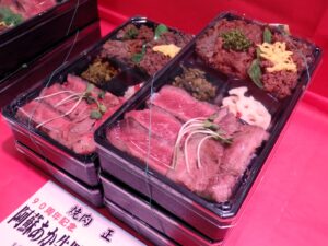 産山村名産のあか牛を使った人気焼き肉店👍井筒屋90周年記念商品「あか牛四種盛弁当」🍱