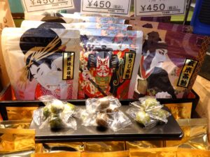 博多座で常設販売されている歌舞伎柄パッケージの本格茶飴🍬左より、焙煎抹茶塩飴、ほうじ茶飴、玄米茶飴💛